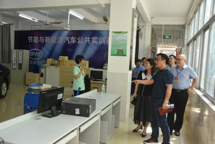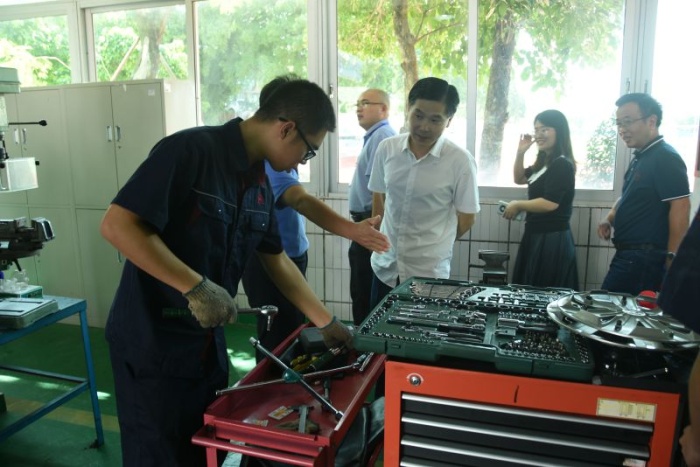 考察團首先走進學(xué)校汽車技術(shù)部的實訓(xùn)場室,觀摩師生上課實操,與師生交流有關(guān)于專業(yè)教學(xué)的設(shè)施設(shè)備、課程內(nèi)容、考核標(biāo)準(zhǔn)等具體內(nèi)容;參觀學(xué)校與企業(yè)合作的汽車維修中心,詢問校企合作的運行機制、運作流程??疾靾F還走進節(jié)能與興能源汽車公共實訓(xùn)基地,了解基地內(nèi)環(huán)境、人員和設(shè)備等情況,感受正在建設(shè)廣東省雙高專業(yè)的新能源汽車維修專業(yè)群的新進展。