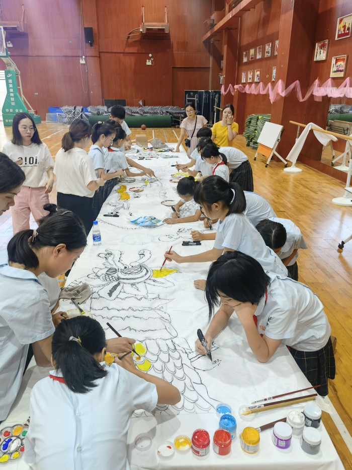 為了弘揚(yáng)優(yōu)秀傳統(tǒng)文化,培養(yǎng)學(xué)生民族精神和愛國主義精神,讓非遺文化進(jìn)入校園。學(xué)校創(chuàng)作主題選取中山市非物質(zhì)文化遺產(chǎn)“起灣金龍”為主題,活動(dòng)前,教師通過給學(xué)生講解起灣金龍的來歷,讓孩子們對(duì)起灣金龍有進(jìn)一步的了解。隨后,20余名學(xué)生一起在畫卷上盡情繪畫。